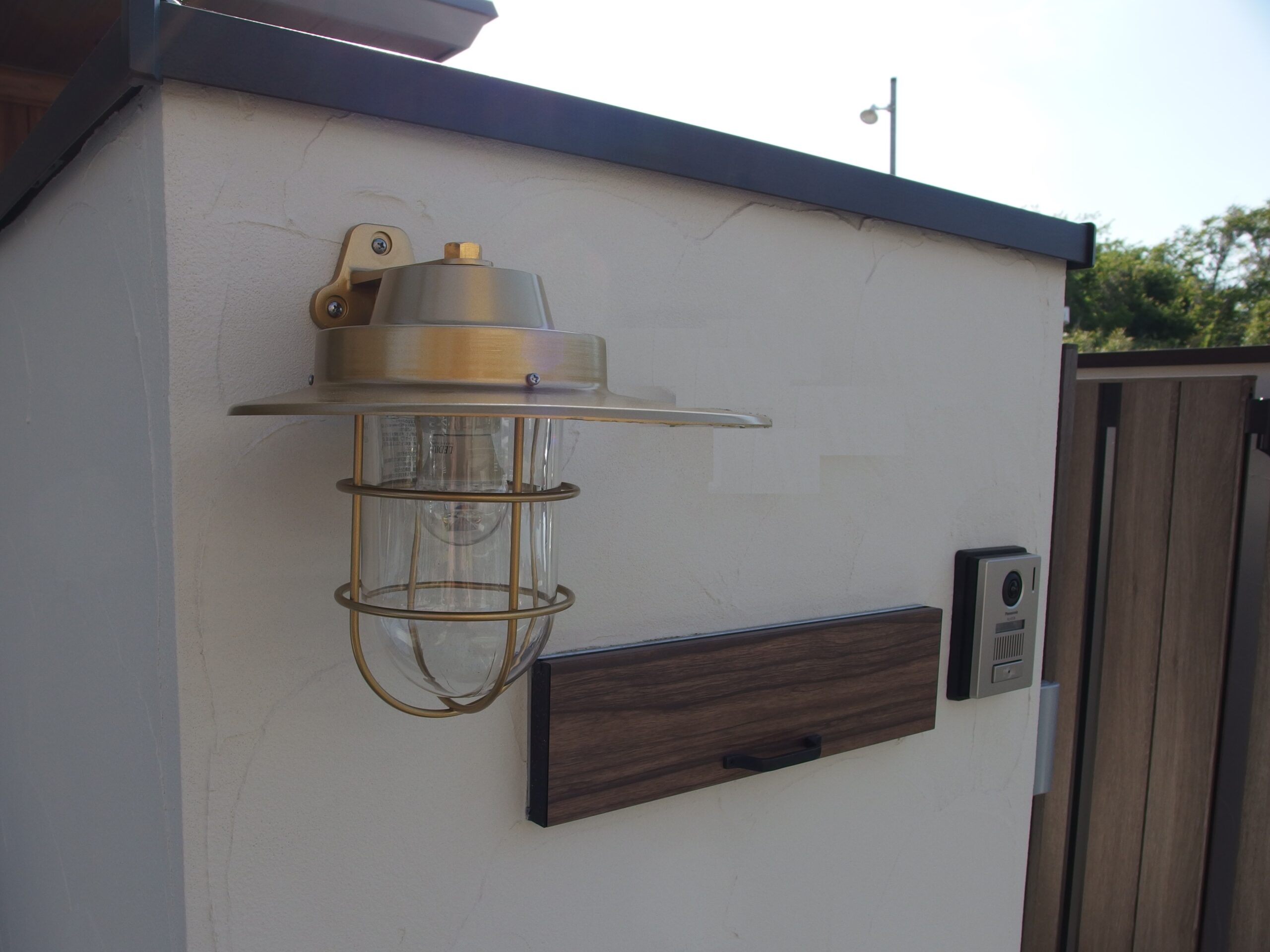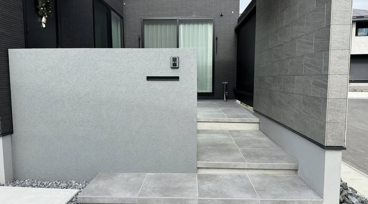 新築外構をお任せいただきました。やわらかな石目のタイルが特徴的な門柱に仕上がりました。