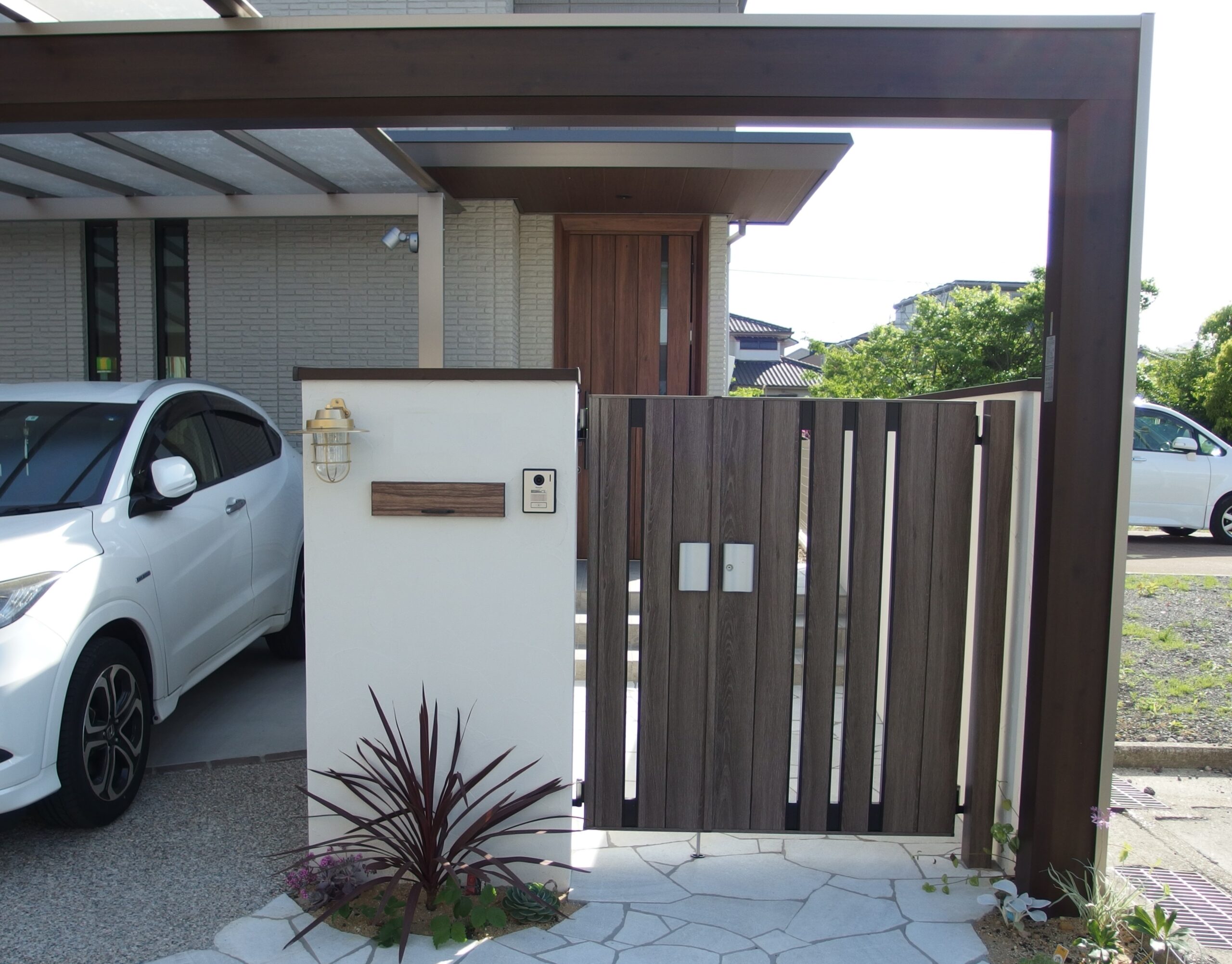 目地をあえて等間隔にしないことにより、スタイリッシュな車庫ができました。存在感のある門柱がかっこいいです。