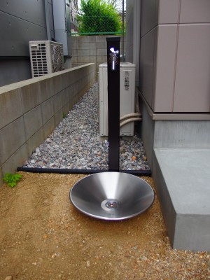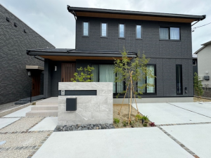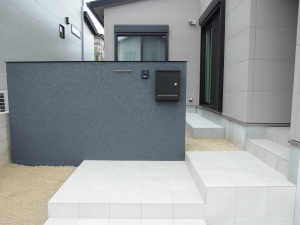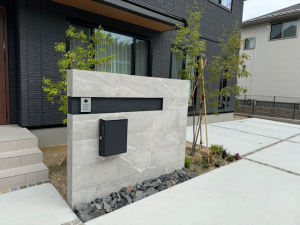 新築外構をお任せいただきました。やわらかな石目のタイルが特徴的な門柱に仕上がりました。