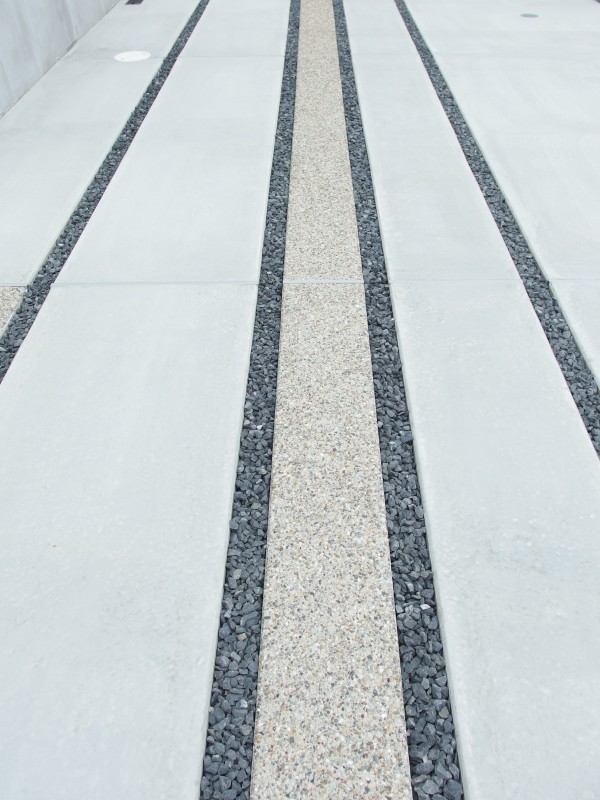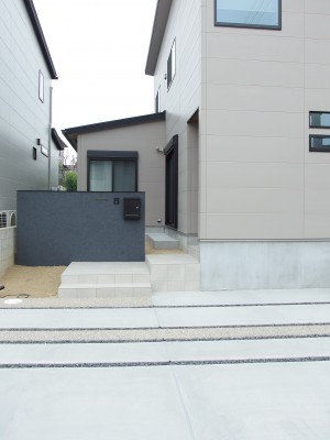 目地をあえて等間隔にしないことにより、スタイリッシュな車庫ができました。存在感のある門柱がかっこいいです。